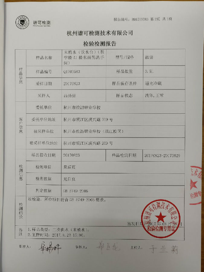 直饮水的工程维护和检测是学校饮食放心工程的重要抓手,现学校按照三个月一次的饮水机换芯和检测规律,经开学再次检测指标水质符合要求,请全体师生放心饮用。现将检测图片提供如下: